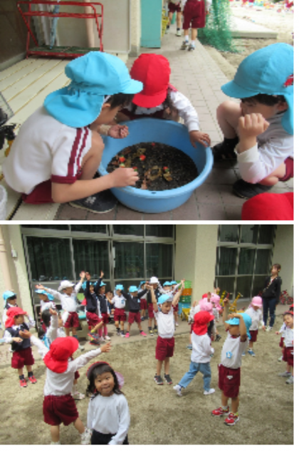 外遊び 公開日 2024/05/08 更新日 2024/05/08 記事 昨日の雨があがって、今日は、園庭でたくさん遊ぶことができました。 園庭では、ままごとをしたり、ダンゴムシの観察をしたり、他のクラスのお友達と一緒に遊ぶ姿も見られます。 それぞれに好きな遊びを楽しんだ後は、みんなで『こいぽぽり体操』もしました。 「ぽぽぽ♪する!」と、3歳児も音楽に合わせて体を動かすことを楽しんでいました。 いいね(0)