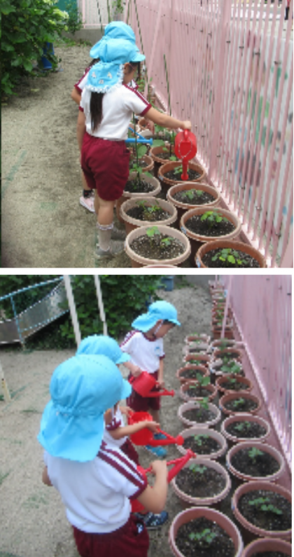 水やりをしながら観察したり、友達と想像したり、生長を楽しみにしている子どもたちです。