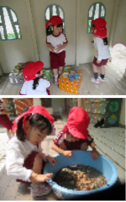 外遊び(3歳児) 公開日 2024/05/22 更新日 2024/05/22 記事 外で遊ぶのが大好きなあか組さん。 先生と一緒にケーキをつくったり、かんなんハウスをスコップでペタペタして“ペンキやさん”になったり、お家の中でごちそうをつくったり、ダンゴムシの観察をしたり・・・好きな遊びを見つけて遊んでいます。 友達と一緒に、新しい遊具に挑戦している姿も見られました。 明日もお外で遊ぼうね!! いいね(0)