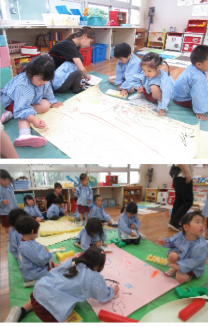 今日は、大きな紙に、クレパスでおえかきをしました。