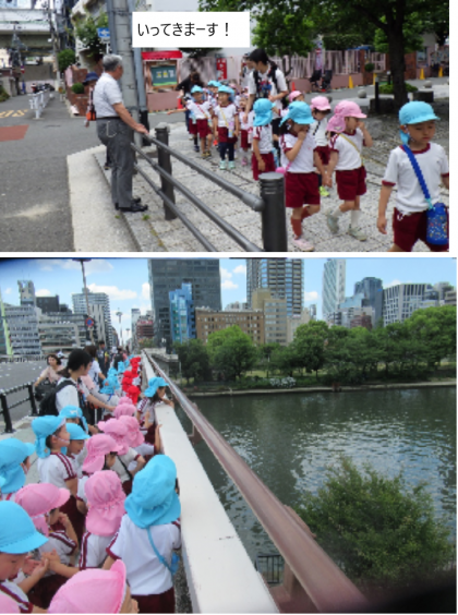 5歳児に手をつないでもらって、地域の方に「行ってきます!」とご挨拶をしたり、川の涼しい風を感じたりしながら、がんばって歩いていました。