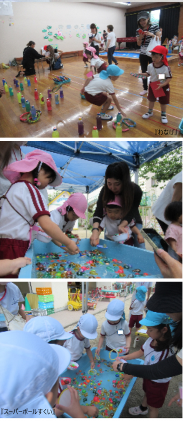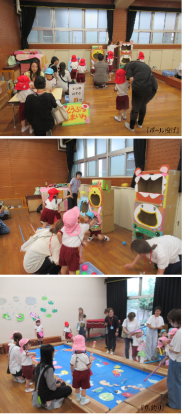 縁日ごっこ 公開日 2024/06/11 更新日 2024/06/11 記事 今日は、PTA主催の『縁日ごっこ』がありました。 子どもたちが楽しく遊べるようにと、ボール投げや魚釣り、わなげなど、いろいろな遊びを考えてくださいました。 今年度は、5歳児も一緒にお店屋さんをしてくれました。 「わなげに来てくださーい!」「魚釣り、あいてます!」など、アナウンスもとっても上手でした。 お家の人も子どもたちもにこにこ笑顔で、とっても楽しい『縁日ごっこ』でした! いいね(0)
