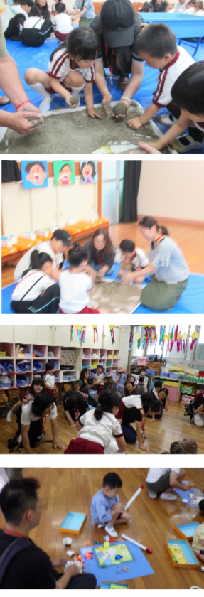 3歳児はお家の人と一緒になかよし遊びを、4歳児は土粘土や米粉粘土を使って感触遊びを、5歳児は泥だんごづくりをしました。