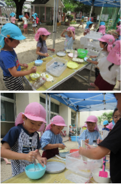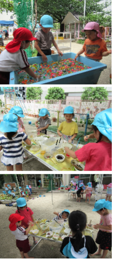 水遊び楽しいね! 公開日 2024/07/09 更新日 2024/07/09 記事 お天気のいい日はプール遊びを楽しんでいる子どもたち。 今日は午後から、どろんこ遊び、色水遊び、泡遊びなどもしました。 「先生、見て!」とふわふわの泡を見せてくれたり、「赤と黄色まぜたら、何色になるか知ってる?」「私、今、夕焼け色つくってるんだ♪」など、友達と話をしながら色水づくりを楽しんだりしていました。 いいね(0)