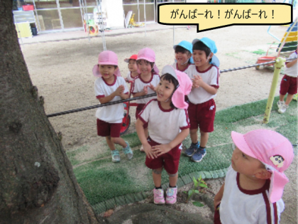 「がんばーれ!がんばーれ!」と応援しながら、のぼっていくセミたちを見守っている子どもたちです。