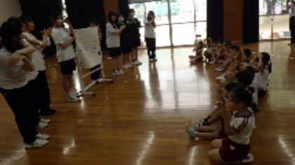 子どもたちは、お姉さん先生のまねっこをしたり、一緒に考えながら遊んだりして、楽しんでいました。