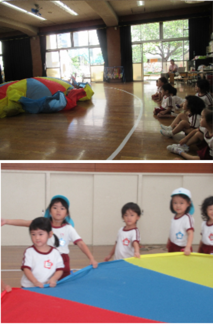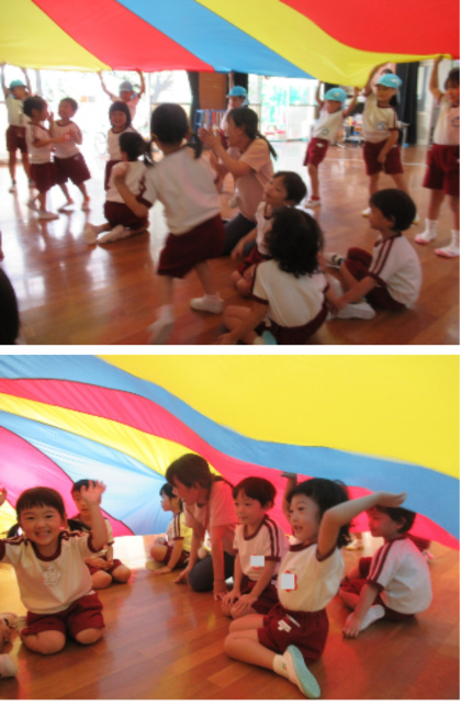 楽しかったー♪ 公開日 2024/10/09 更新日 2024/10/09 記事 お遊戯室から音楽が聞こえてくると、「何をしてるのかな?」といつも見に来ているあか組さん。 今日は、ずっとやってみたかったそら組さんのパラバルーンに入れてもらいました。 中では、跳んでパラバルーンに触ってみたり、寝転んで見上げたりしていました。 友達と顔を見合わせて、にっこり笑顔でとっても楽しそうでした。 いいね(0)