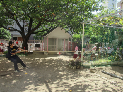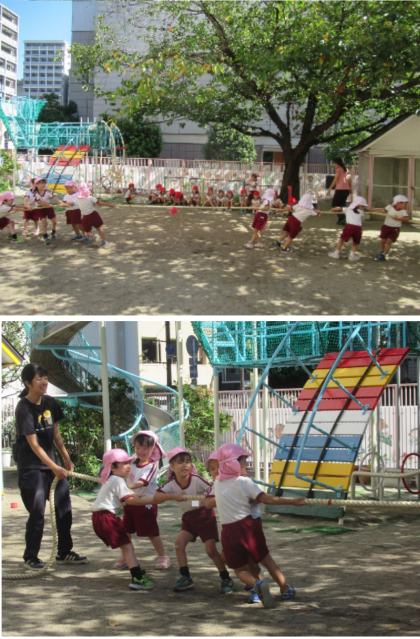 そら組さんの綱引きを見て、ずっとやってみたかったもも組さんが、園庭で綱引きをしていました。