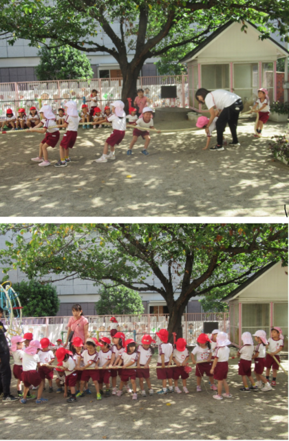 「おもたかった」「○○くん、めっちゃ強いなあ!」「もう一回やりたい!」と初めての綱引きを楽しんでいました。