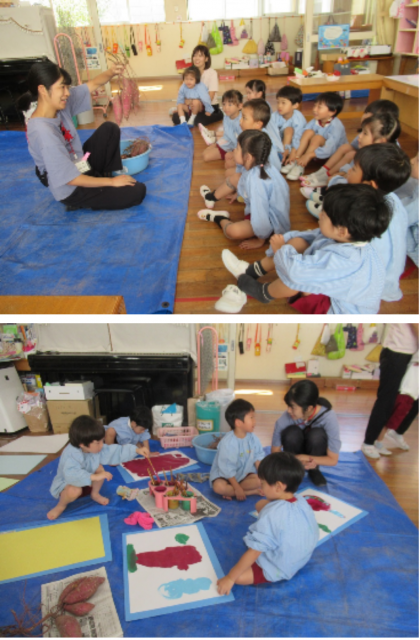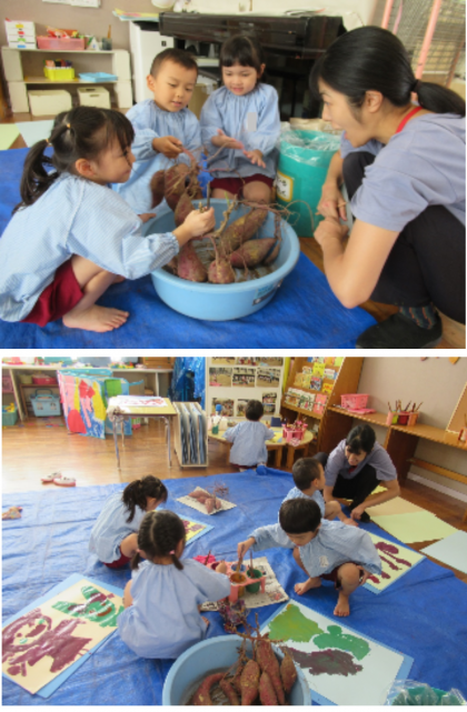 絵をかきました(3,4歳児) 公開日 2024/10/25 更新日 2024/10/25 記事 昨日の芋ほりがとっても楽しかった子どもたち。 自分の掘った芋の話をしたり、実際に芋を見たり触ったりしながら、絵の具で絵をかきました。 「これ、ぜーんぶお芋!」「お芋のお家がスタートで、大きなお芋がゴールだよ!」「これは、イチゴ味のお芋♪」など、楽しかった経験や、自分の中で膨らませたイメージを絵で表現していました。 子どもたちのお話がたくさん聞こえてくる楽しい絵ができあがりました。 いいね(0)