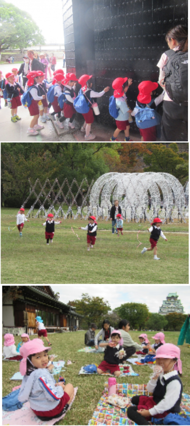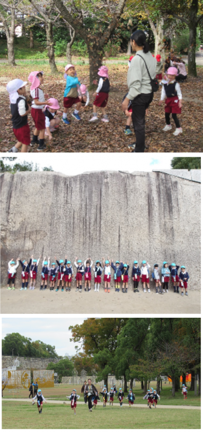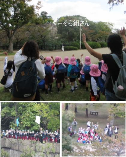 西の丸庭園で遊んでいたあか組さん、もも組さんと「おーい!」と呼びかけ合ったり、「こっちに来てね〜」「今から行くね〜」と手を振り合ったりすることもできました。