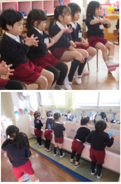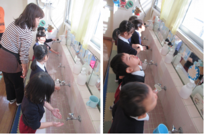 手洗いうがいの仕方を再確認し、その後は、とても丁寧に手洗いうがいをする姿が見られました。