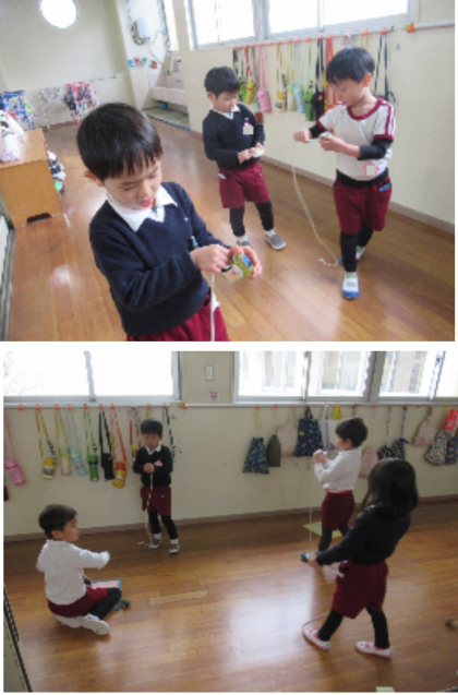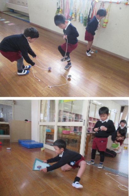 せんせい、みて!! 公開日 2025/01/16 更新日 2025/01/16 記事 4歳児、5歳児がコマまわしをがんばっています。 根気よく毎日遊んでいるので、紐を巻くのがとても上手になり、コマもまわるようになってきました。 「せんせい、みて!まわった!」「ぼくは、91かいめ♪」ととても楽しそうです。 5歳児は、まわしたコマを紐でお散歩させたり、下敷きや手に乗せてまわしたりする技にも挑戦中で、それを見た4歳児も「すごい!」「どうやってするの?」と教えてもらいながら、一緒に遊んでいます。 いいね(0)