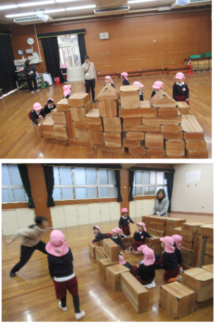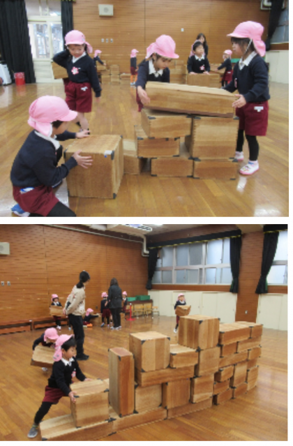 絵本の中に出てきた“レンガのお家”をみんなでつくって遊びました。