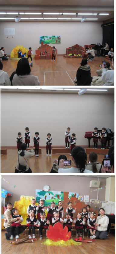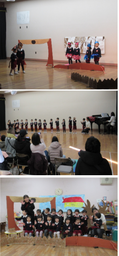たくさんのお客様を前にして緊張も見られましたが、劇遊びや楽器遊びなど、みんなと楽しんできた遊びをお家の方に見ていただくことができて、あたたかい拍手をたくさんもらうことができて、とてもとても嬉しそうでした(^^♪
