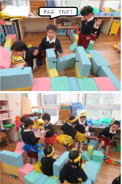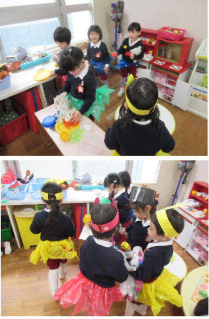 へやあそび(3歳児) 公開日 2025/02/21 更新日 2025/02/21 記事 あか組では、おうちごっこやアイス屋さんごっこ、おままごとなどをして遊んでいます。 発表会で着たお気に入りの衣装を身につけて、かわいいオニさんがスパゲティーをつくっていました。 「いーれーて」「いいよ♪」と仲良く遊んでいるあか組さんです。 いいね(0)