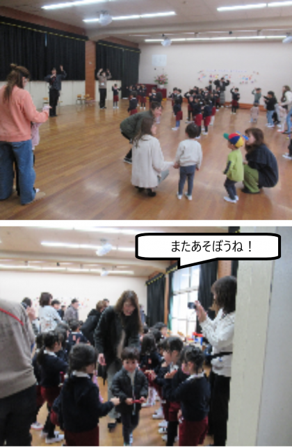 新入園児一日入園 公開日 2025/03/19 更新日 2025/03/19 未就園児 今日は、次年度入園するお友達が、幼稚園に遊びに来てくれました。 受付では、もも組さんが元気いっぱい挨拶をし、案内の手紙を渡してくれました。 一緒に遊んだり、体操をしたり、菅南幼稚園の歌を紹介したりしました。 画用紙でつくったチューリップをプレゼントすると、小さいお友達が喜んでくれて、子どもたちもとても嬉しそうでした。 4月になったら、いっぱい一緒に遊びましょうね! いいね(0)
