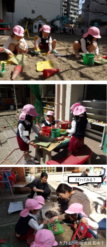 飼育ケースの掃除をしていると、大きくなったカブトムシの幼虫に興味津々の子どもたち。