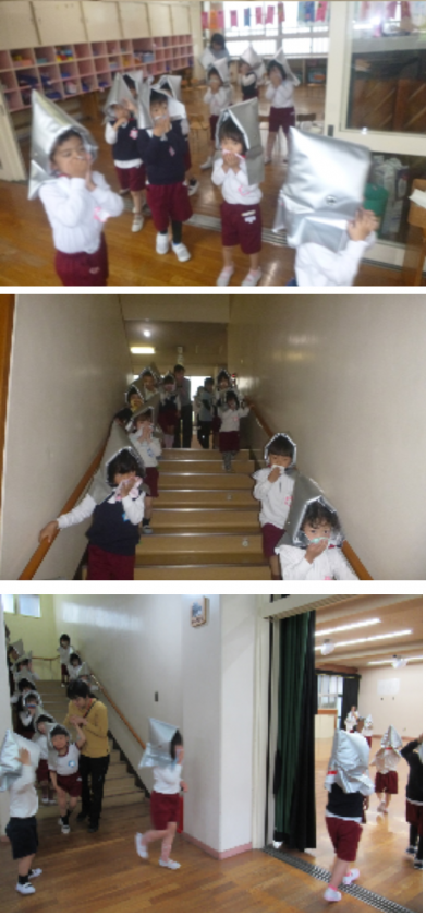 避難訓練をしました 公開日 2025/04/23 更新日 2025/04/23 記事 今日は、火災を想定して、避難訓練を行いました。 保育室では、子どもたちが避難訓練についての約束事や防災頭巾のかぶり方などの話を真剣に聞いていました。 避難を知らせる放送が鳴るとすぐに先生のところに集まり、安全に避難することができました。 3歳児は、4、5歳児の様子を見ながら、初めての避難訓練を経験しました。 保護者の引き渡し訓練にもご協力いただき、ありがとうございました。 いいね(0)