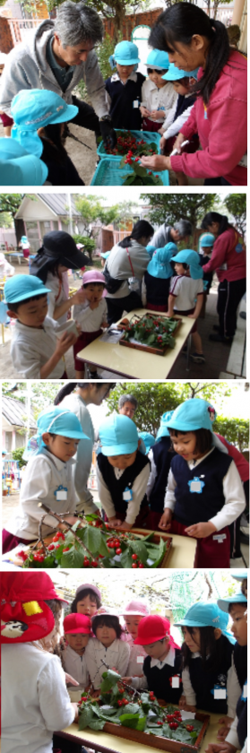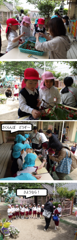 サクランボ、おいしそう♪ 公開日 2025/05/01 更新日 2025/05/01 記事 園庭のサクランボが赤くおいしそうに実っています。 いつも落ちているサクランボでままごとをしている子どもたち。 今日は、収穫してもらったサクランボを「おいしそう!」「ぷにぷにしてる♪」と見たり触ったりしていました。 帰りには“サクランボやさん”の子どもたちからお土産をもらって、とても嬉しそうなあか組さんでした。 いいね(0)