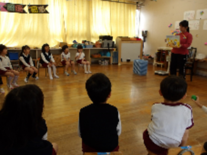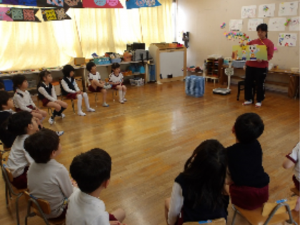 今月は、紙芝居を見ながら“朝ごはんの大切さ”についてお話を聞きました。