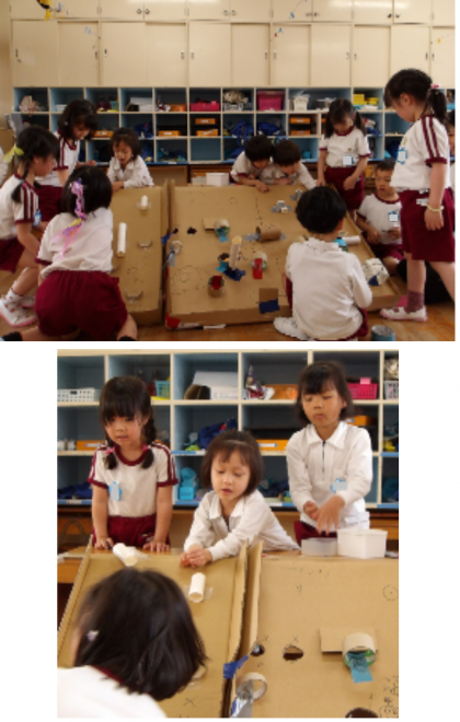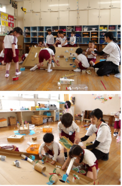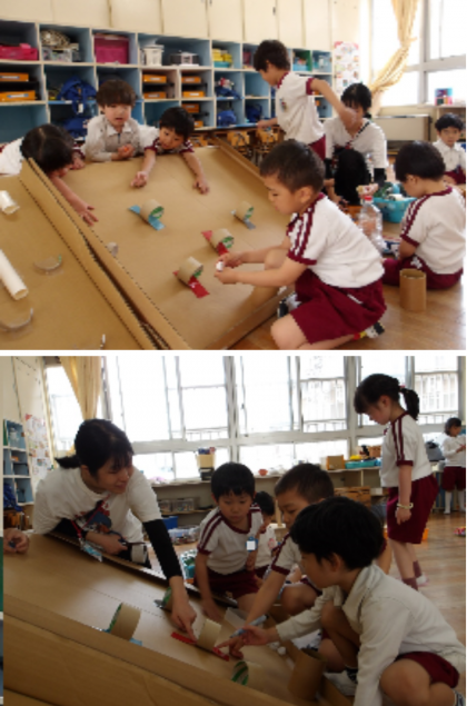 22てん! 公開日 2025/05/19 更新日 2025/05/19 記事 そら組の子どもたちは、ビー玉転がしをして遊んでいます。 初めは、何もない坂道で玉を転がして遊んでいたのですが、今では「ここに入ったら22点!」「ここに落ちたらゲームオーバーやで♪」など、友達と一緒にいろいろなしかけを考えて楽しんでいます。 いいね(0)