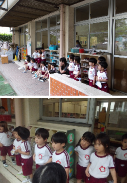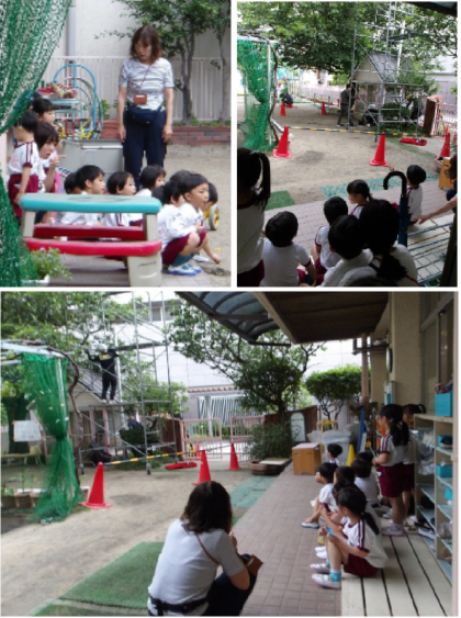 園庭に足場ができ、音が聞こえてくると子どもたちは興味津々!!