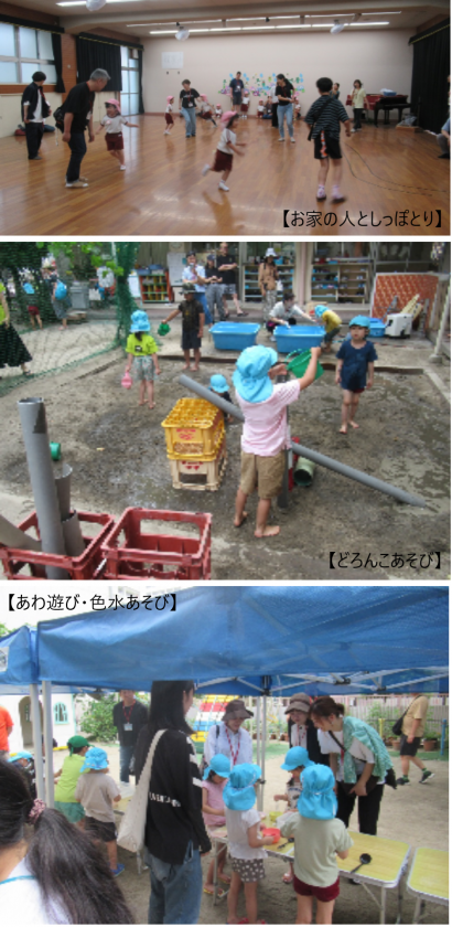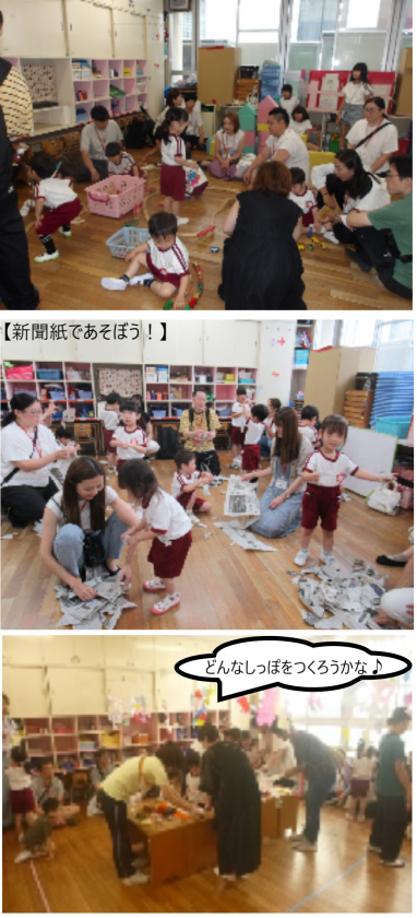 新聞遊びやしっぽとり、どろんこあそびなど、お家の方と一緒に遊ぶことができて、子どもたちはとても楽しそうでした。