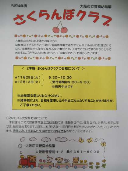 さくらんぼクラブ(未就園児 園庭開放)を行います。