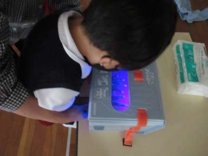 2.洗った手をブラックライトにあてると、きれいに洗ったはずの手の洗い残しが、白く浮かび上がってきます!!