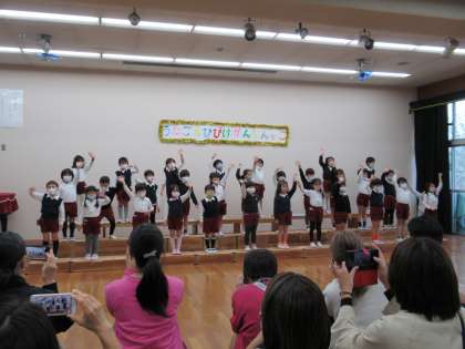 遊戯室に舞台をつくり、たくさんのお家の方が見守る中、子どもたちの大好きな歌を4曲歌いました。
