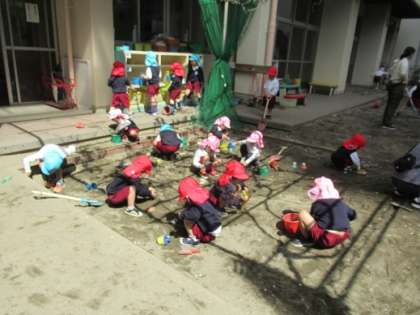 お家の人と離れるのはドキドキしたり、寂しくなって泣いてしまったりすることもありましたが、大きい組さんが朝の用意を手伝ってくれたり、お外で一緒に遊んでくれたりしたので、だんだんと笑顔も見られるようになりました。