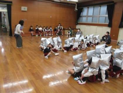 4歳児・5歳児は、防災頭巾をかぶって遊戯室に避難しました。