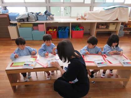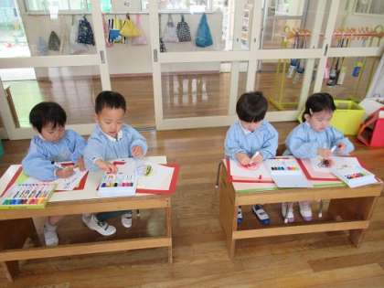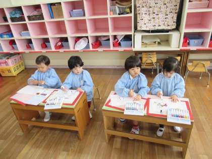 好きな色のペンを持ち、「アンパンマン!」「くまさんかいたよ」「ぐるぐる〜」と、思い思いにおえかきを楽しんでいました。