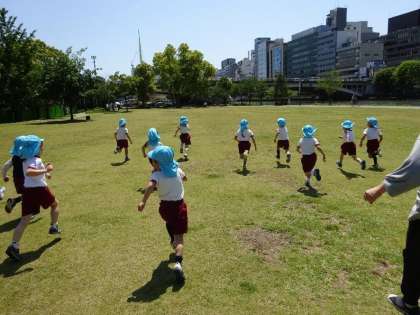 中之島公園まで園外保育に行きました。とてもいいお天気で、バラ園にはきれいなバラがたくさん咲いていました。「いいにおいがする!」「こっちの黄色いバラがすごくきれい!」と子どもたちが口々に言っていました。広い芝生でのかけっこはとても気持ちよかったです!