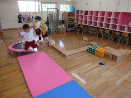今日は、積み木で道をつくり、最後はトランポリンで10回跳んでジャンプ!して遊んでいました。