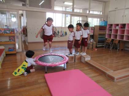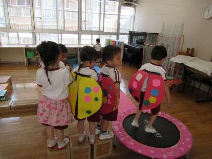子どもたちはお気に入りの『(テントウムシの)テンテンちゃん』に変身して、高く跳ぶのを楽しんでいました。