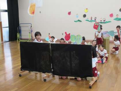 おいしそうな食べ物が出てきたり、たくさん食べたアオムシが大きくなったりするのが楽しかったようで、小さい組さんはニコニコとても楽しそうに見ていました。