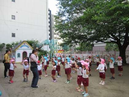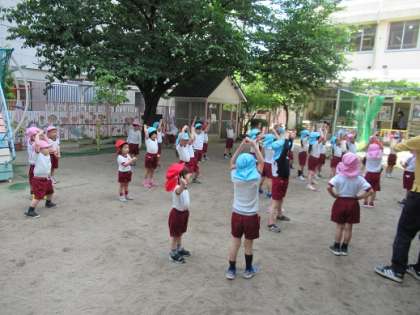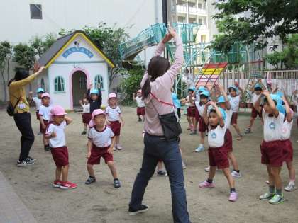 外遊びの後に、みんなで『どうぶつ列車がやってきた』の体操をしています。