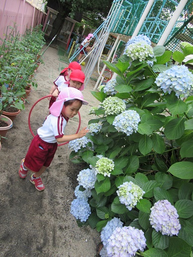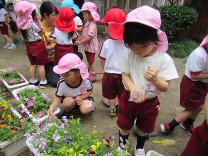 最近は、園庭に咲いているペチュニアやビオラの花びらを使って、色水遊びも楽しんでいます。