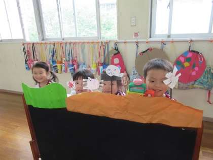 そら組さんの『あおむし劇場』を見たもも組さんが、まねっこしてペープサートで遊んでいます。