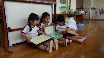 もも組では、空き箱で作ったパソコンが大流行しています!「ここを押すと写真が撮れるよ!」「僕のも見て!」と会話が弾んでいました。キーボードも子どもたちが自分で考え、工夫したところがいっぱいです。見ていると思わず笑みがこぼれました。