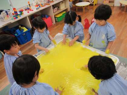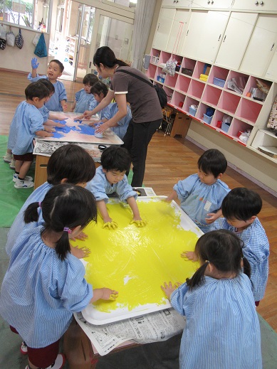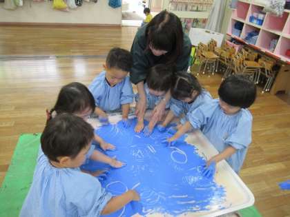 絵の具を塗り広げながら感触を楽しんでいる子、普段触らないその感触に戸惑いながらも指一本で触っている子など、それぞれに興味をもっている様子が見られました。