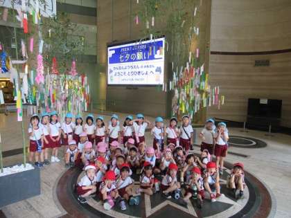 たくさん短冊が飾ってある笹を見て、「大きい!!」「すごいね♪」「ぼくのはどこかなぁ?」「あっちも見よう!」と友達と一緒に話もはずんでいました。