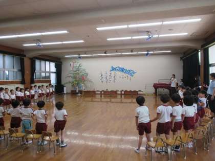 「これは何組さんがつくったのかな?」と大笹に飾った笹飾りをみんなで見たり、『お星さまにも聞こえますように…』と『たなばたさま』の歌を歌ったりしました。