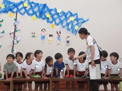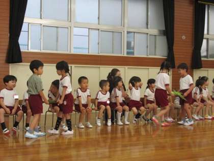 年長児がお供え物の夏野菜を紹介してくれ、小さい組さんも「それ知ってる!」「食べたことある!」と言いながら興味深く見ていました。