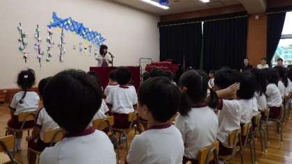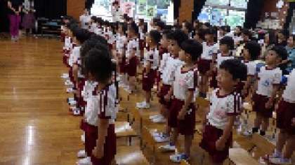 今日は1学期の終業式を行いました。遊戯室に3クラス、みんなが集まりました。園長先生から、1学期頑張ったことをほめていただき、拍手をもらって、子どもたち自身も1学期の成長を感じて誇らしげな顔をしていましたよ。天満警察署の方にも来ていただき、交通安全指導もしていただきました。信号や「止まれ」の標識の話をしていただき「とびださない」の約束もしました。約束を守って安全に楽しい夏休みを過ごしてくださいね!