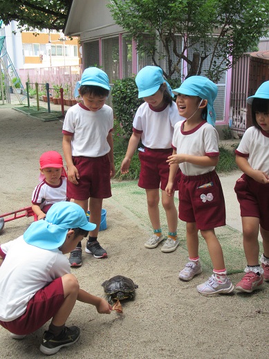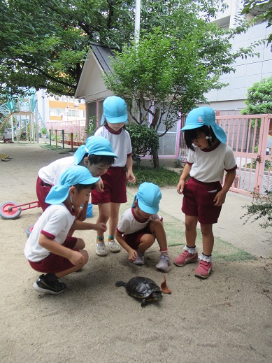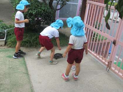 のんびりカメさんが急に速足で歩きだした時には、「どこ行くのー!?」と追いかけながら、とても楽しそうな子どもたちでした。