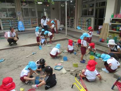 5歳児が受付をしてくれ、かわいいお友達に園庭の遊具を紹介したり、一緒に砂場で遊んだりしていました。