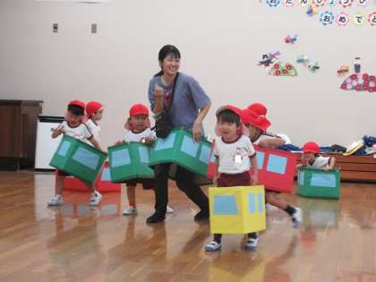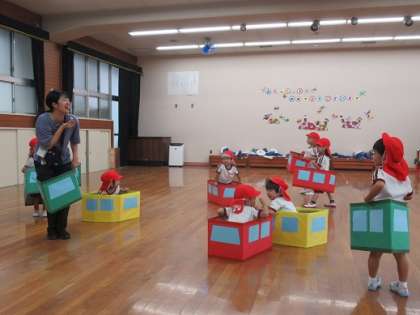 「私は赤!」「ぼくは黄色にする!!」と、好きな色の電車に乗って、広い遊戯室をみんなで走りました。。